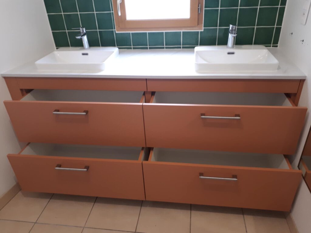Réalisation d’un agencement de point d’eau avec fabrication et installation sur mesure d’un ensemble de deux modules de cuisson, dotés de tiroirs à fermeture douce pour un confort d’utilisation optimal.