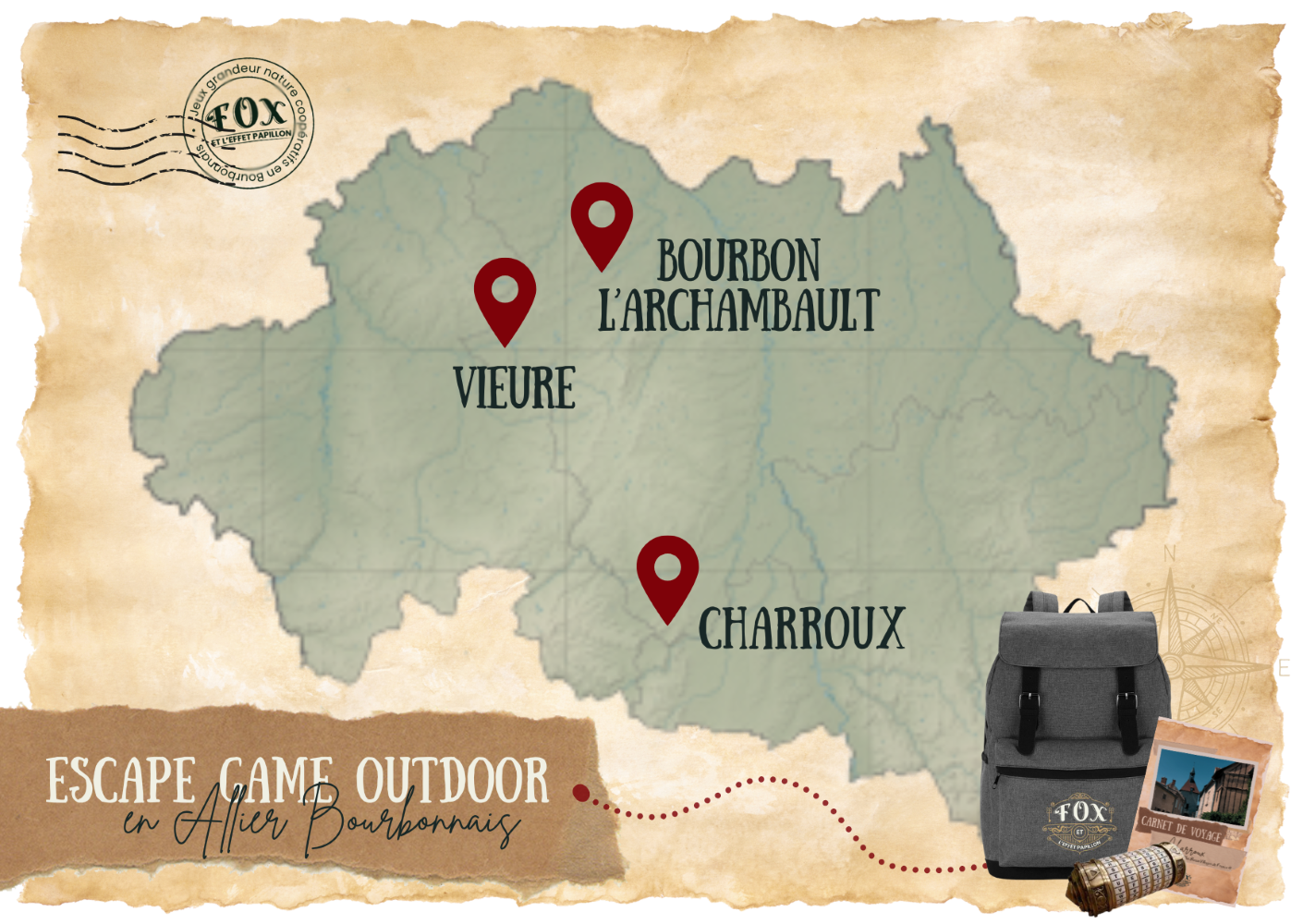 Découvrez les secrets de l’Allier-Bourbonnais dans un escape game outdoor. Un mystérieux sac à dos, un carnet de voyage, quelques accessoires : vous voici embarqués pour une chasse aux trésors agrémentée d’objets à manipuler et d’énigmes, au grand air ! Ces jeux permanents sont disponibles sur réservation auprès des structures touristiques locales pour les individuels. Fox assure l’animation pour les groupes.
