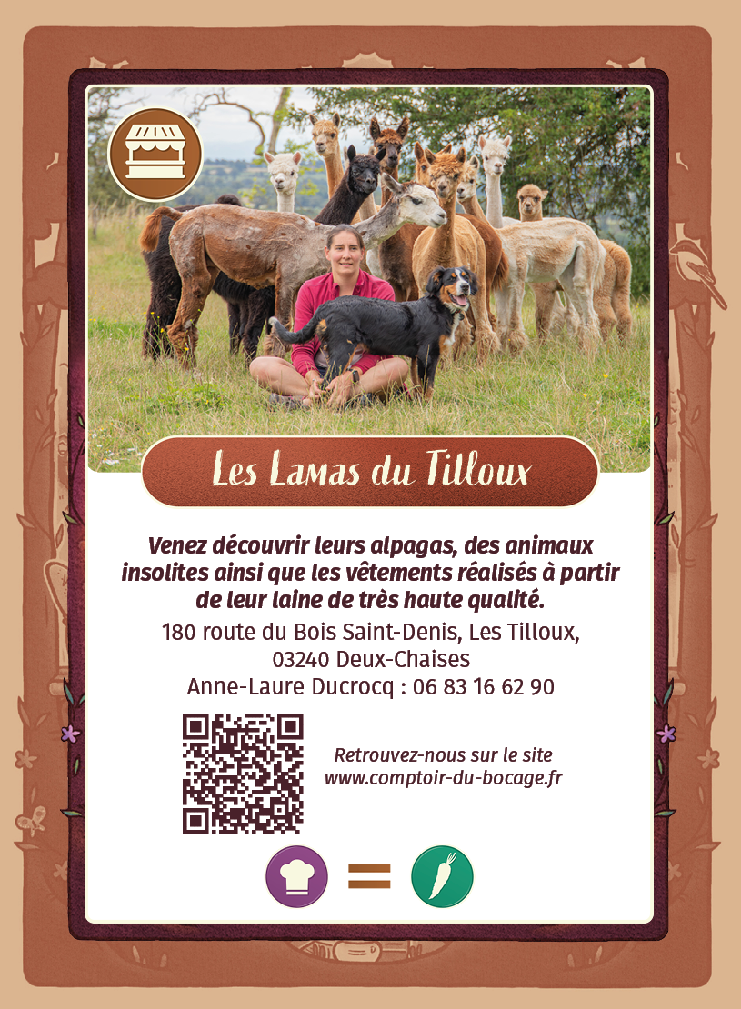 Au cœur du Bocage bourbonnais à Deux-chaises dans l'Allier, venez découvrir des animaux insolites, et la fabrication de farine et de pâtes fermières. Les alpagas du Tilloux vous seront présentés lors d'une visite commentée, durant laquelle vous irez au plus prés des animaux dans les champs (en fonction des conditions météo) . Ce sont des animaux originaires du continent sud-américain élevés spécifiquement pour leur laine de très haute qualité. Des ateliers sur le thème de la laine sont proposés également pour les groupes d'enfants (devis personnalisé).